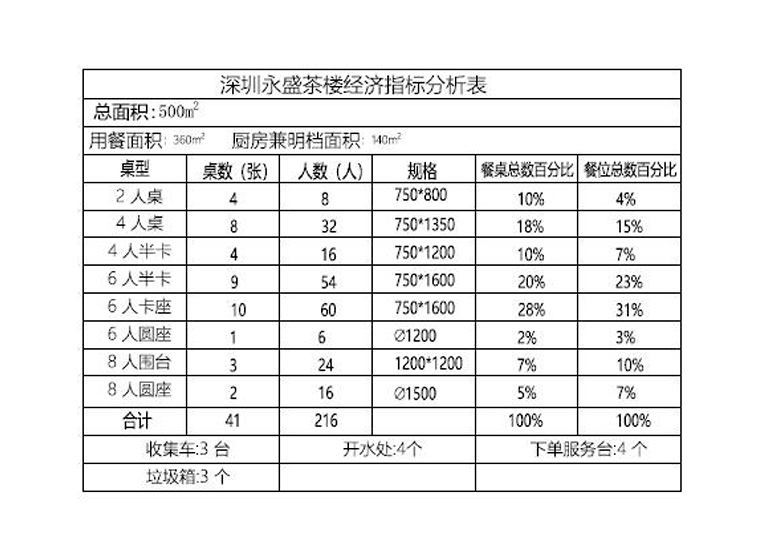 1、平面布局:悅得閑龍崗店餐廳實際使用面積約500平米,為了讓我們的新鮮現做是完全可以看得見,我們使用了明廚亮灶的做法,后廚的空間面積達到140平米,展示面盡可能開闊。餐區面積達到360平米,實際布置位置216個,其中六人位、六人半卡、六人圓卡占總餐位數的57%,四人位、四人圓卡占22%,八人位占7%,2人位占4%。這種餐位布局符合茶樓都是家庭客為主,用餐人數集中在4-6人的一家三代人為多的餐飲狀況。在滿足基本舒適度的同時,盡可能多布位置,提升餐廳的經濟效應指標。