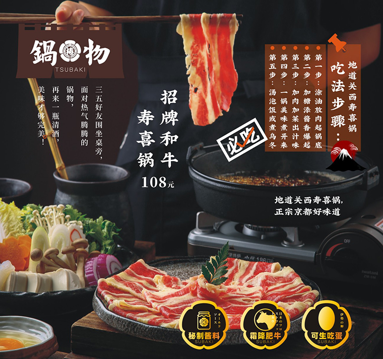 壽喜鍋也可以深入挖掘,做成日本火鍋料理100平米的小店。通過品類的細(xì)分,打造專注專業(yè)的品牌形象,還可以進(jìn)一步優(yōu)選食材,放大競爭優(yōu)勢,并利用宣傳推廣渠道,取得區(qū)域市場的領(lǐng)先優(yōu)勢。