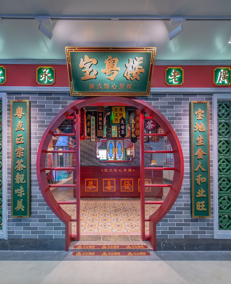 ”這一識別度高,歷史感強,且符合點心茶樓這一品類特性的匾額樣式設計變化成寶粵樓的標志LOGO圖形。綠色的匾額,金色的字體,用金字招牌的形式把寶粵樓的歷史內蘊完美表現出來。我們將寶粵樓的主體色定為紅色和綠色。其中紅色使用的面積最大,大量出現在空間裝飾裝修中,綠色則主要出現在各種物料應用設計中。深綠色在老廣州西關的古建筑中,出現的頻率很高,是非常具有歷史厚重感的一種色彩。