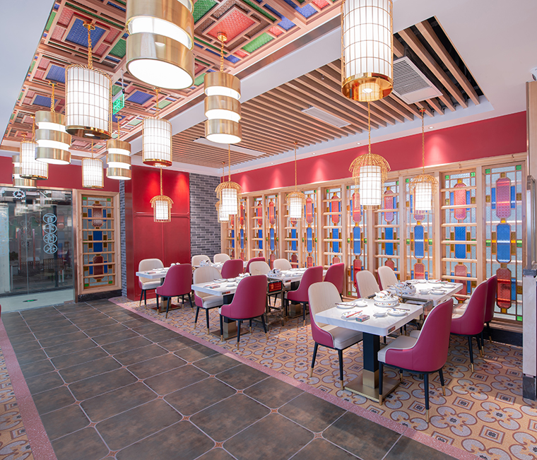 廣式花窗,又稱為滿洲窗。源自于廣州最開始與外國開展海外貿易,是典型的舶來品。滿洲窗不同的款式和花紋組合體現了使用者的生活富足與審美情趣。廣式花窗可以很好的表現廣式點心茶樓的品類屬性,具有一目了然,一見如故的特性。在寶粵樓的空間設計中,我們將廣式花窗大面積使用門口兩側的主形象,包房隔斷、甚至天花吊頂上,形成了強烈的視覺沖擊力,具有鮮明的老廣州西關韻味。