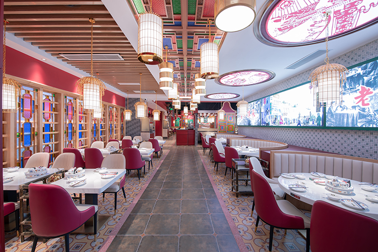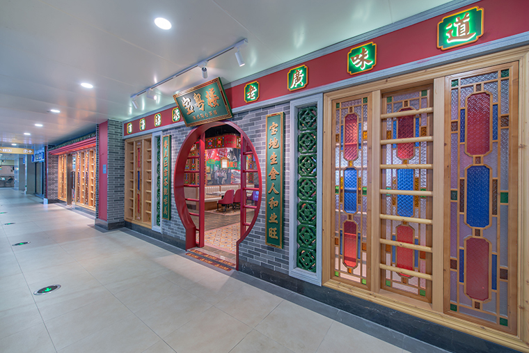 寶粵樓將嶺南園林古建筑的鑊耳山墻,廣式花窗引入整體空間裝飾中,大面積紅色、深綠色、廣式灰磚的搭配使用,將傳統廣州西關文化以時尚更精致的形式表現,為上海人民帶來了提溜鳥籠嘆早茶的“得閑飲茶”生活方式。